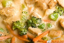 Брокколи разделите на соцветия, морковь порежьте соломкой. Порежьте приготовленные куриные грудки полосками и сложите в смазанную маслом огнеупорную посуду со сваренными не до готовности брокколи и морковью.