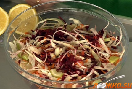 Очистить сельдерей (или белокочанная капуста), морковь и свеклу, помыть. Затем натереть овощи на крупной терке. И перемешать.