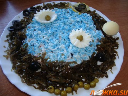 По центру блюда выложить салат. Белок окрасить в синем пищевом красителе, посыпать сверху салат – это будет синее озеро. Вокруг салата положить морскую капусту – уже получается «дикое» озеро. Озеро украсить водяными лилиями из белка, вырезав фигурно и положить внутрь зелёную горошинку. По кантику озера украсить бабочкой из лимона, грибочками из яйца и маслин, гусеницей из горошка.