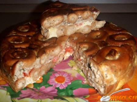 Закрыть крышку мультиварки и готовить пирог из сушек в течение 60 минут на режиме Выпечка. После окончания режима выпечки открыть крышку и дать пирогу постоять в мультиварке около получаса. Если вытащить пирог сразу, то он может развалиться на части, а остывая в мультиварке слои пирога крепко схватываются между собой. Спустя полчаса вынуть пирог из мультиварки с помощью решетки для варки на пару, переложить на блюдо. Пирог готов. Несмотря на то, что снизу и сверху пирога расположены слои из сушек, нарезать его очень легко, пропитанные молоком сушки во время выпечки становятся мягкими и сочными.