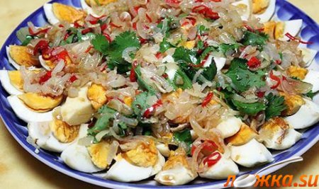 Яйца разрезать на четвертинки и выложить на блюдо.
