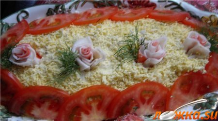 Украсить - нарезать помидоры кружочками и выложить по кругу салата. В середине салаты выложить розочки сделанные из крабовых палочек.