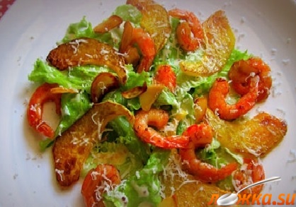 Добавить к салатным листьям тыкву с чесноком, креветки и посыпать тёртым пармезаном.
