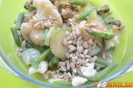 Смешать овощи, мидии, подсолнечные семечки.