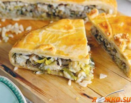 Тесто разделить на две неравные части: 2/3 и 1/3. Раскатать большую часть в пласт толщиной 1 см. Выложить в центр половину риса с зеленью, оставив свободные края теста по 8 см.