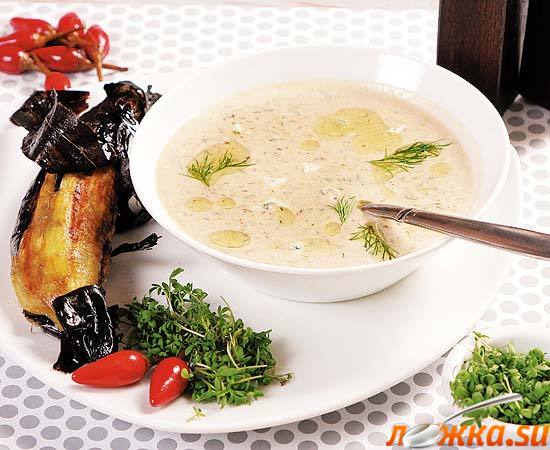 Нарезать баклажан крупными кубиками и положить в поджарку из лука и чеснока, затем добавить сыр «Дор Блю» и залить куриным бульоном. Дать покипеть 5 минут, влить сливки и кипятить еще 5 минут; добавить кинзу, укроп, петрушку и все взбить в блендере до однородной массы; приправить солью и молотым перцем.