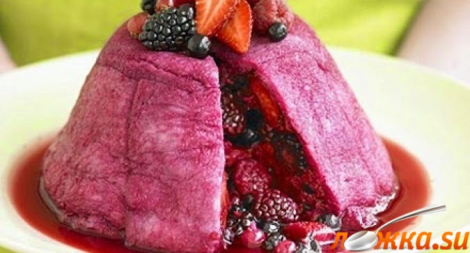 Постройте пудинг: каждый кусок хлеба обмакнем в сок на несколько секунд только, чтобы покрыть его соком. Выложите хлеб в нижней части миски: опустите прямоугольные куски по одному в миску, чтобы они сочетались друг с другом аккуратно, поочередно размещая широкие и узкие концы хлеба. Теперь ложите на хлеб по ложке размягченных фруктов, добавляя целые ягоды клубники в разброс.