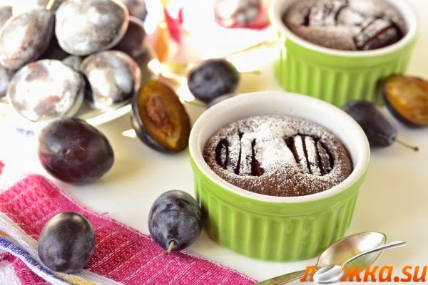 Разогреть духовку до 180 градусов по Цельсию. Поместить муку, какао и сахар в миску. В миске соединить яйца, сливки и ваниль и взбить венчиком. Добавить к мучной смеси и перемешать. Добавить нарезанный шоколад и перемешать. Вылить тесто на небольшие рамекины или в большую неразъемную форму для выпечки. Сверху разложить сливы и выпекать в течение 20-25 минут или до готовности.