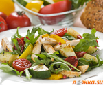 В разогретое оливковое или кукурузное масло высыпаем мелко нарезанный чеснок и слегка обжариваем его до золотистого цвета. В получившееся чесночное масло засыпаем тыкву, нарезанную кубиками средних размеров и обжариваем. За несколько минут до завершения жарки тыкву нужно посолить и немного подсластить. Это поможет сделать вкус более ярким. Отваренное куриное филе нарезаем соломкой средних размеров и слегка обжариваем в оливковом или кукурузном масле, по желанию можно добавить специи. Порционно раскладываем на тарелки листья зеленого салата, чтобы полностью закрыть поверхность. На листья салата выкладываем теплую тыкву. На тыкву "рассыпаем" куриное филе. Перец нарезаем соломкой, помидор - кружочками и украшаем салат. При желании салат можно слегка сбрызнуть винным уксусом.