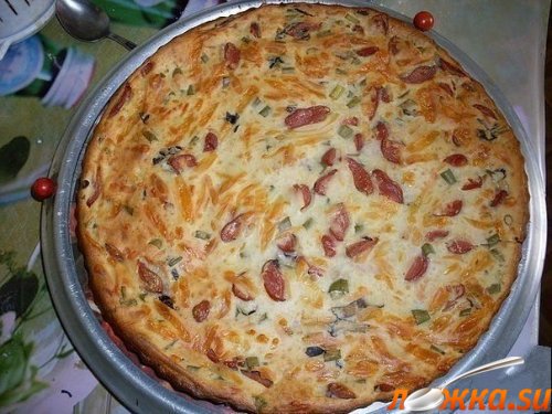 Растираем яйца с солью, вливаем стакан кефира. Можно добавить ложку сахара для пикантности. Жидкость хорошо перемешиваем и добавляем в него частями, перемешивая, муку с разрыхлителем или содой. Тесто будет, как на оладьи. Когда тесто вымешено, добавляем в него порезанные сосиски или мясо, натертый сыр на терке, любимые приправы и зелень Хорошо смешиваем и выливаем на смазанную маслом форму. Выпекаем в жарочном шкафу около 30 минут при 180 градусах – до подрумянивания.