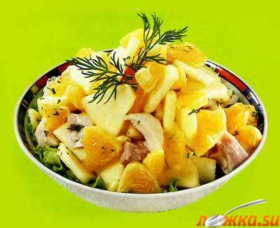 Нарежьте небольшими кусочками отварную индейку. Почистите апельсины и яблоки от кожуры и семян. Нарежьте небольшими кусочками. Добавьте майонез в аджику и лимонный сок. Заправьте отварную индейку и фрукты. Переложите салат в салатницу. Сверху украсьте дольками яблока и апельсина, зеленью.