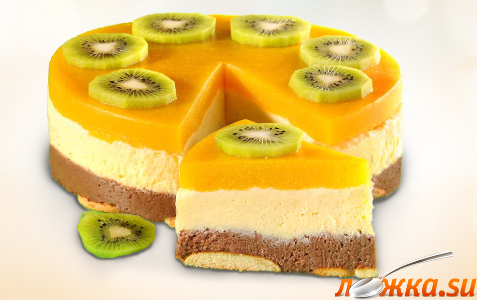 Украсьте верх торта очищенным и нарезанным кружочками киви или другими фруктами и конфетюрами. Прятного чаепития!