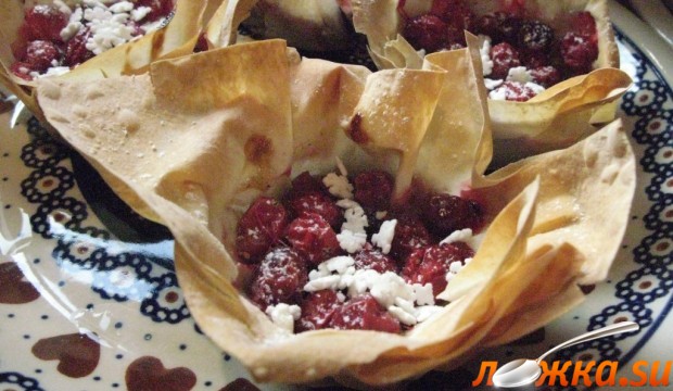 2 куска теста фило нарезать на ленты шириной 1 см, смочить их растительным маслом и выложить на фрукты.