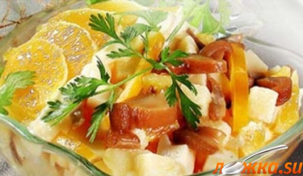 Заправить кушанье соусом, соединив указанные ингредиенты, перемешать и выложить в салатник.