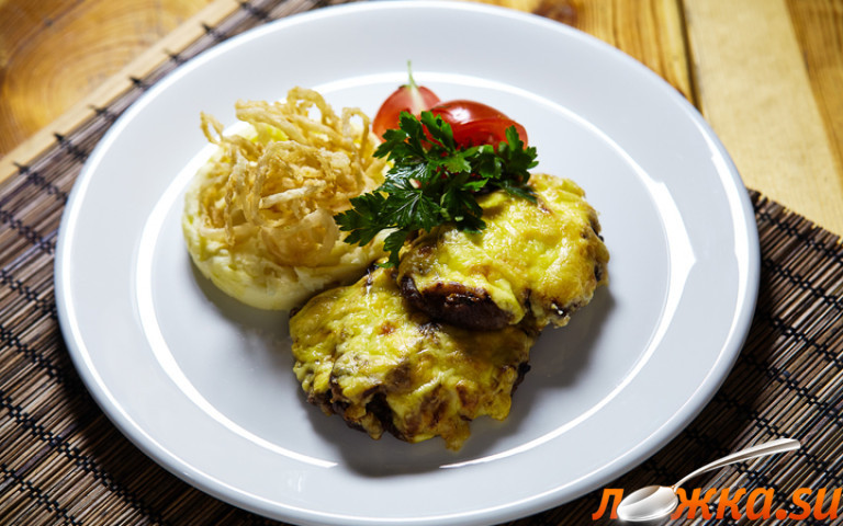 6. Жареные куски мяса выложить на противень. На каждый кусочек мяса равномерно выложить обжаренные лук и шампиньоны.