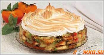 Форму выложите в один слой бисквитными полосками, пропитанными ликером, и уложите на них часть приготовленного крема и фруктов. Затем вторым слоем выложите полоски с ромовой пропиткой, вновь покройте их кремом и фруктами. Выкладывайте бисквитные полоски и крем по очереди, пока они не закончатся.