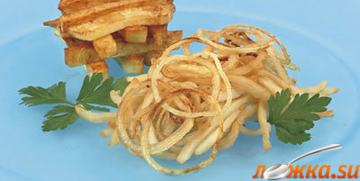 Лук нарежьте кольцами, слега посыпьте просеянной мукой, перемешайте и обжарьте в сильно разогретом масле до светло-золотистого цвета. Выньте лук шумовкой, переложите на сито, чтобы стек лишний жир. Лук посолите, осторожно перемешайте.