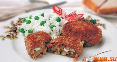 Котлетную массу формуют на ладони в виде лепешки, на середину укладывают фарш, края соединяют и придают изделию форму кирпичика. Панируют в сухарях.