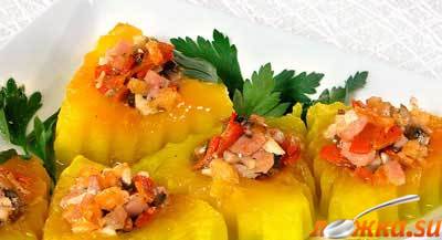 Наполнить готовым фаршем тыквенные треугольники, уложить на смазанный оставшимся маслом глубокий противень и поставить в разогретую до 180 °С духовку. Запекать в течение 10-12 минут.