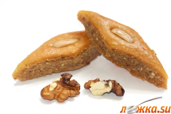 Дать пахлаве подойти на противне в течение 10 минут, смазать яичным желтком, затем разрезать на ромбовидные кусочки (7 на 5 см) и сразу же поставить в нагретую до температуры 200 - 220 градусов духовку. Через 10 - 12 минут пахлаву вынуть, залить растопленным маслом, вновь смазать яйцом, затем снова поставить в духовку, в которой убавлен огонь, и выпекать еще 20 - 25 минут. После выпечки горячую пахлаву, не вынимая из противня, залить по линиям разрезов медом.