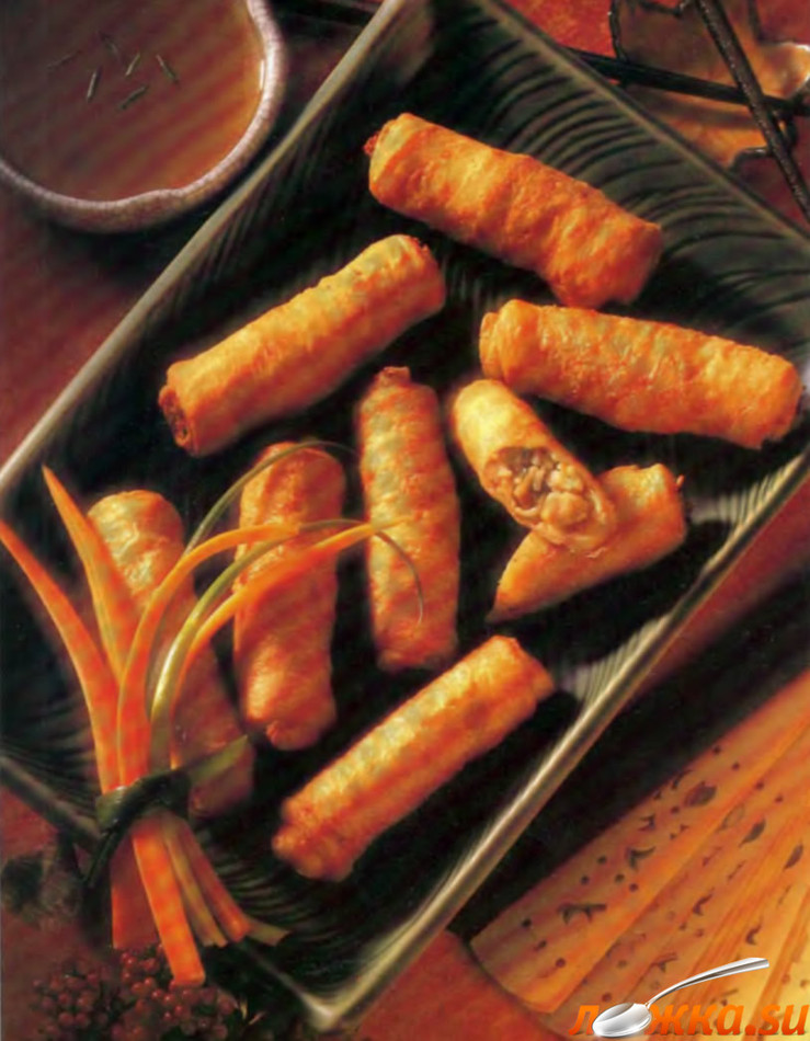 11. Разогрейте большую сковороду до 190°С. Положите 4—6 трубочек на сковороду и обжаривайте, пока они не станут золотистыми и хрустящими (примерно 3—5 минут). Таким же образом обжарьте все остальные трубочки. Обсушите бумажными полотенцами, гарнируйте по желанию. Сервируйте с кисло-сладким соусом.