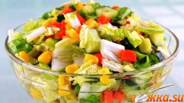 В глубокую миску для салатов переложите все нарезанные ингредиенты: морковь, огурцы, пекинскую капусту, листья салата. Высыпьте консервированную кукурузу, перемешайте все хорошенько. Приправьте салат растительным (или оливковым маслом), посолите, поперчите на свой вкус.