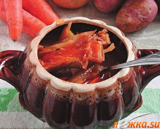 6. За 5–6 минут до окончания приготовления добавить аджику и залить кипятком. Готовые щи настаивать 5–10 минут.