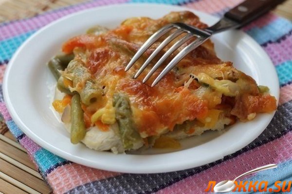 Разогреваем духовку до 200С градусов. Куриное филе моем и разрезаем вдоль на 4 стейка. Получившиеся стейки отбиваем кухонным молоточкам, солим и перчим. Затем, выдавливаем чеснок через чесночницу и растираем с двух сторон. Выкладываем стейки в форму. Преступаем к овощам. Тут нет определенной пропорции овощей, добавляйте больше тех, которые любите. Я указала примерную массу каждого ингредиента, но все по вкусу. Морковь чистим и натираем на средней терке. Лук мелко нарезаем. Перец режем на небольшие прямоугольники. Кабачок нарезаем тонкими полосочками. Помидоры черри режем на четвертинки. Можно использовать обычные помидоры.Все нарезанные ингредиенты перемешиваем. Добавляем к ним стручковую фасоль. Я использовала замороженную, перед добавлением промыла ее под холодной водой. Овощи немного солим, перемешиваем хорошо и выкладываем на куриное филе.Посыпаем все тертым сыром и добавляем по краю немного воды. Ставим в разогретую духовку до 200 С градусов и запекаем минут 40 или до готовности.