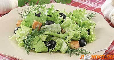 Салат полейте соусом, посыпьте кубиками обжаренного батона и оформите маслинами.