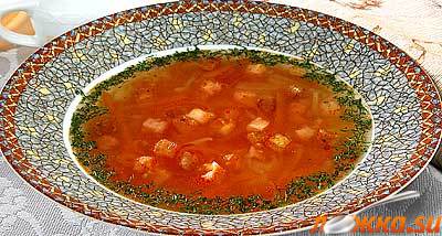 В кипящий бульон положите мелко рубленную капусту, помидоры, очищенный и нарезанный соломкой перец, обжаренные лук и сало, добавьте вино, перец, соль и доведите до кипения. Варите в течение 5–6 минут.