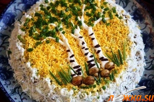 Сверху салат украсить полосками чернослива, в виде ствола берёзы, листочками из зелени петрушки. Посадить грибочки и сделать травку из зелени укропа.