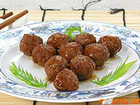 Лук очистить, вымыть, мелко нарезать. Мясо промыть, пропустить через мясорубку,добавить лук, мисо и крахмал. Перемешать, сформовать из фарша фрикадельки и обжарить их в растительном масле. Смешать даси с десертным вином и соевым соусом, довести до кипения, влить в сковороду с фрикадельками и готовить 4–5 мин. Зелень петрушки и кинзы вымыть, мелко нарезать. Огурец и помидор вымыть, нарезать кружочками.