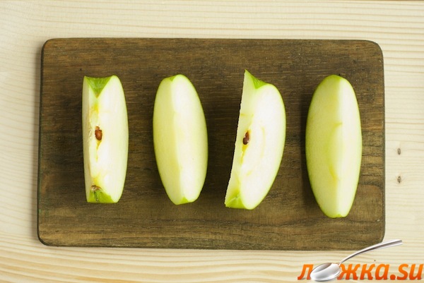 Нарежьте багет небольшими кусочками. Яблоки очистите от кожуры и нарежьте соломкой. Обжарьте яблоки на сливочном масле около пяти минут, добавьте мед и корицу. Полученную начинку намажьте на хлеб. Запекайте гренки в духовке примерно пять минут, при температуре 180 гр С.