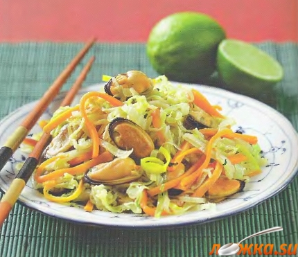 В сковороде разогреваем растительное масло и обжариваем морковь 5 минут на среднем огне. Добавляем порей и готовим еще 2 минуты. Добавляем мидии, готовим 2 минуты. Всыпаем китайскую капусту и зелень. Вливаем соевый соус, перемешиваем. Готовим еще 2 минуты. Снимаем с огня, поливаем соком лайма. Солим, еще раз перемешиваем и выкладываем в салатницу. Салат подаем теплым.