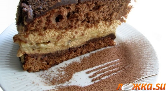 Бананы очищаем от кожуры и режем на тонкие кружочки. Половину карамельного крема выкладываем на бисквит, затем бананы, после этого смазываем торт оставшейся половиной карамельного крема. Все хорошо разравниваем при помощи лопатки.