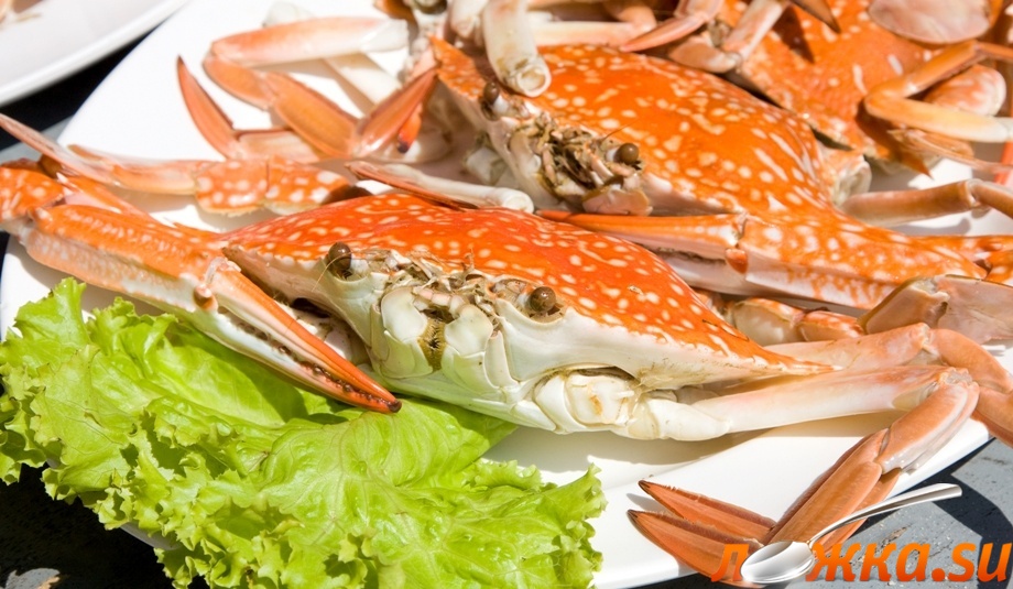 Крабы – представители ракообразных. Они могут обитать и в морской, и в пресной воде. Питаются эти животные беспозвоночными. Размножаются крабы, откладывая в укромные места икринки, которые проходят ряд промежуточных превращений, прежде чем стать взрослой особью. Внешний вид крабов У краба маленькая голова, сливающаяся с грудью. Сверху тело краба защищено хитиновым панцирем, который является внешним скелетом. Панцирь эти животные меняют во время роста несколько раз за жизнь. В период линьки старый панцирь отходит, а новый пока не пропитается в достаточной мере известью, остается некрепким, что делает животное очень уязвимым. Вот поэтому, чтобы хоть как-то защититься в этот опасный период, крабы маскируются под цвет и фактуру окружения. С этой же целью в первые дни после линьки они прячутся и не охотятся. На передней паре ног у крабов расположены клешни, которые помогают им охотиться и спасаться от преследователей. В случае опасности крабы могут скинуть клешни. Интересен тот факт, что кровь у крабов голубого цвета. Польза крабов В пищу употребляют мясо крабов, которое является деликатесным морепродуктом с удивительно нежным вкусом. Мясо у крабов находится в клешнях, лапках и на спинке. Так как в каждой особи мяса немного, то добыча краба в промышленных объемах трудоемка, что определяет высокую его стоимость. Крабовое мясо – богатый источник полноценного белка, с низким содержанием жира. Углеводы в составе его отсутствуют. Это становится важным фактором при включении диетического мяса краба в рацион тучных людей и больных ожирением. Белок крабов легко переваривается и усваивается организмом, ведь в крабовом мясе практически отсутствует соединительная ткань. Благодаря этому при относительно невысокой калорийности крабов чувство насыщения достигается довольно быстро. В структуре белка значительную долю занимает аминокислота таурин, которая поддерживает здоровье мышц и кровеносных сосудов, сетчатки глаза. О пользе краба можно судить также по наличию омега-6 и омега-3 жирных кислот, снижающих в крови человека содержание «вредного» холестерина, что в свою очередь значительно уменьшает риск сердечно-сосудистых заболеваний и атеросклероза. Крабы, обитающие в море, накапливают много йода – важнейшего микроэлемента для человека. Йод входит в структуру гормонов щитовидной железы, а они участвуют в регуляции всех видов обмена веществ, отвечают за развитие нервной системы и рост человека. Всего 20 – 40 г мяса крабов содержат суточную норму йода. Богат краб и витаминами, особенно РР и группы В, а также микроэлементами. Цинк и селен из морепродукта участвуют в образовании тестостерона – полового гормона у мужчин. Поэтому для них польза краба заключается еще и в поддержании либидо. Также в его мясе содержатся медь, кальций, фосфор, сера, натрий, магний и др. Крабы полезны для людей, страдающих нарушениями пищеварения, ожирением, сердечно-сосудистыми заболеваниями и патологией щитовидной железы, при нарушениях зрения, анемии, депрессии или нервном перенапряжении. Калорийность крабов составляет примерно 85 ккал на 100 г продукта. Приготовление крабов Так как краб обладает очень вкусным мясом, то даже простые рецепты приготовления дают в результате изумительно нежные деликатесные блюда. Так, чтобы отварить краба, нужно добавить в воду