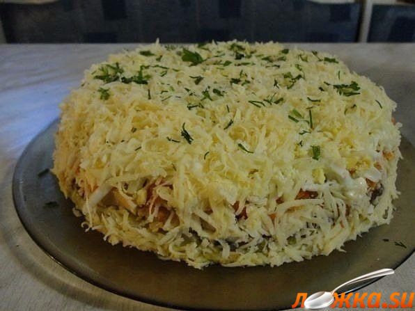 Салат выкладывается слоями: картофель, потом грибы, майонезная сетка, курица кусочками, лук, морковь, майонез, яйца, сыр, майонезная сетка.
