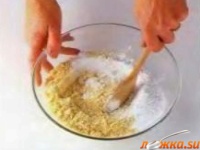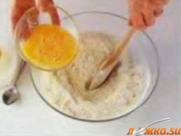 Делаем углубление и вливаем эссенцию, лимонный сок и яйцо или белки в количестве, достаточном для образования стойкой плотной пены. Вымешиваем деревянной ложкой.