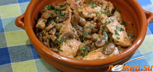 Влейте в сковороду вино, бульон и положите петрушку. Жарьте несколько минут, пока жидкость не уменьшится вполовину. Выложите в сковороду курицу, перемешайте. Посыпьте свежей зеленью петрушки.