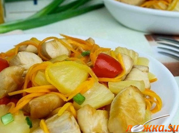 Нарезать перец небольшими кусочками. Добавить его к курице вместе с ананасами, молотым имбирем, соевым соусом, медом. Посолить и поперчить. Обжарить на среднем огне около 15 минут.