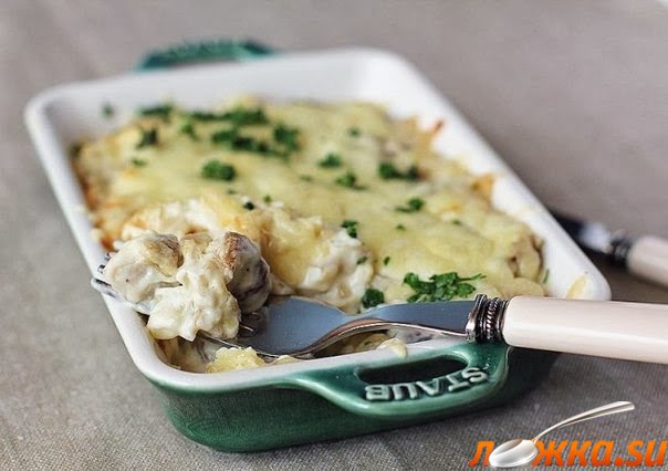 1. Филе курицы режем крупными кусочками, грибы "пластинками". Курицу и грибы кладём в сковороду и обжариваем на сливочном масле.
