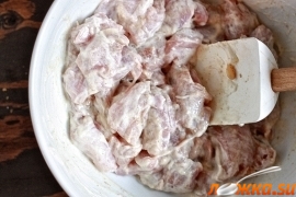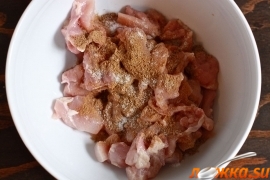 Отделите мясо куриных бедрышек. Нарежьте небольшими кубиками. Приправьте солью, кориандром и тмином.
