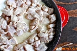 Смешайте кукурузную муку со сливками и влейте к курице. Тушите еще 10 минут.