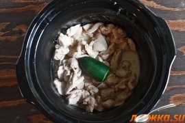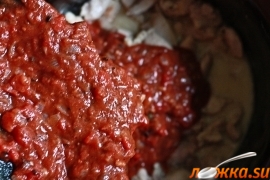 Добавьте измельченные помидоры. Протушите немного и вылейте соус в медленноварку. Тушите курицу в течении 5 часов.