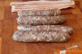Для его приготовления понадобятся сырые колбаски для барбекю и бекон.