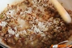 Перемешайте и обжарьте в течении 2-3 минут. Добавьте порциями муку, постоянно помешивая.