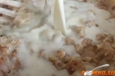Влейте муку, продолжая размешивать. Тушите на медленном огне, пока соус не загустеет.