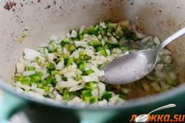 7. Когда жир стечет, убираем из миски мясо. Ставим ее на огонь, разогреваем и засыпаем туда наши овощи. Обжариваем на медленном огне. Если жира буде недостаточно, добавьте оливкового масла.