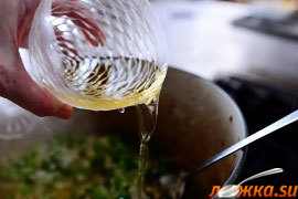 8. Добавляем чеснок, перемешиваем. Через 1-2 минуты вливаем бокал вина, продолжая помешивать, пока вино не выпарится.