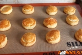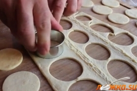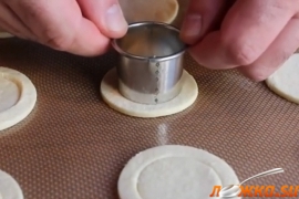 С помощью стакана или специальной формочки выдавите из теста кружки. Их должно получиться 12 штук. Уложите кружки на покрытый пергаментом лист для выпечки.